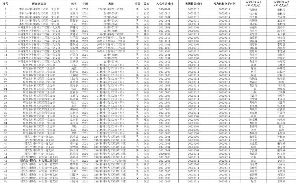 党建动态 当前位置: 首页 > 党建思政 > 党建动态 > 正文 yl88858永利集团2022年3月入党积极分子名单公示 作者:时间:2022-03-15浏览次数: 各党支部、团支部: 经各团支部“推优”、学院团委审核以及各党支部委员会讨论研究决定,确定张子豪等51位同志为入党积极分子,现将名单公示如下: 公示时间:3月14日--3月16日,公示期内,凡对以上同志确定为入党积极分子有意见者,请及时以口头或书面的形式向我院党委或党支部反映问题。 联系电话:86845861,联系人:魏厚钱。 E-mail:clxydjwyh@163.com ;办公室地址:24-404。 yl88858永利集团党委 2022年3月14日 附件【20212022学年第二学期3月yl88858永利集团入党积极分子名单.xlsx】已下载次