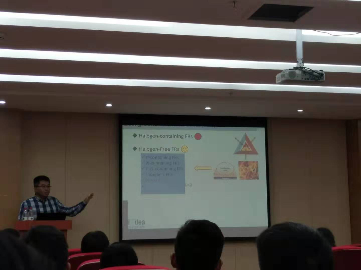 王教授首先就目前阻燃纳米材料国内外研究现状进行了介绍,对研究前期的构思、实验的前期准备及实施步骤做了阐述,接下来总结了自己的研究成果,最后指出今后阻燃纳米复合材料的发展是多功能性、高效化。会后,师生们积极与王博士交流,现场学术气氛热烈。王博士深入浅出的为师生介绍了阻燃纳米复合材料,报告现场座无虚席,师生对此赞不绝口。