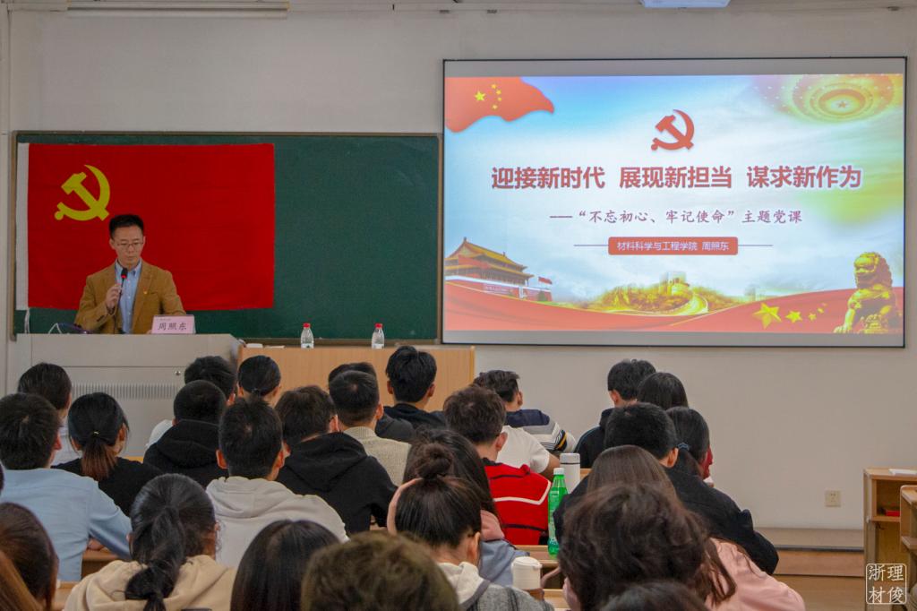 周照东老师以“迎接新时代 展现新担当 谋求新作为”为主题,通过对比国内和国外的生活环境引入课程内容,党课中首先强调不忘初心,牢记使命”的重要性以及解释说明了初心和使命是什么。随后“不忘初心,牢记使命”的历史溯源、基本要求、实践路径三个方面进行讲述