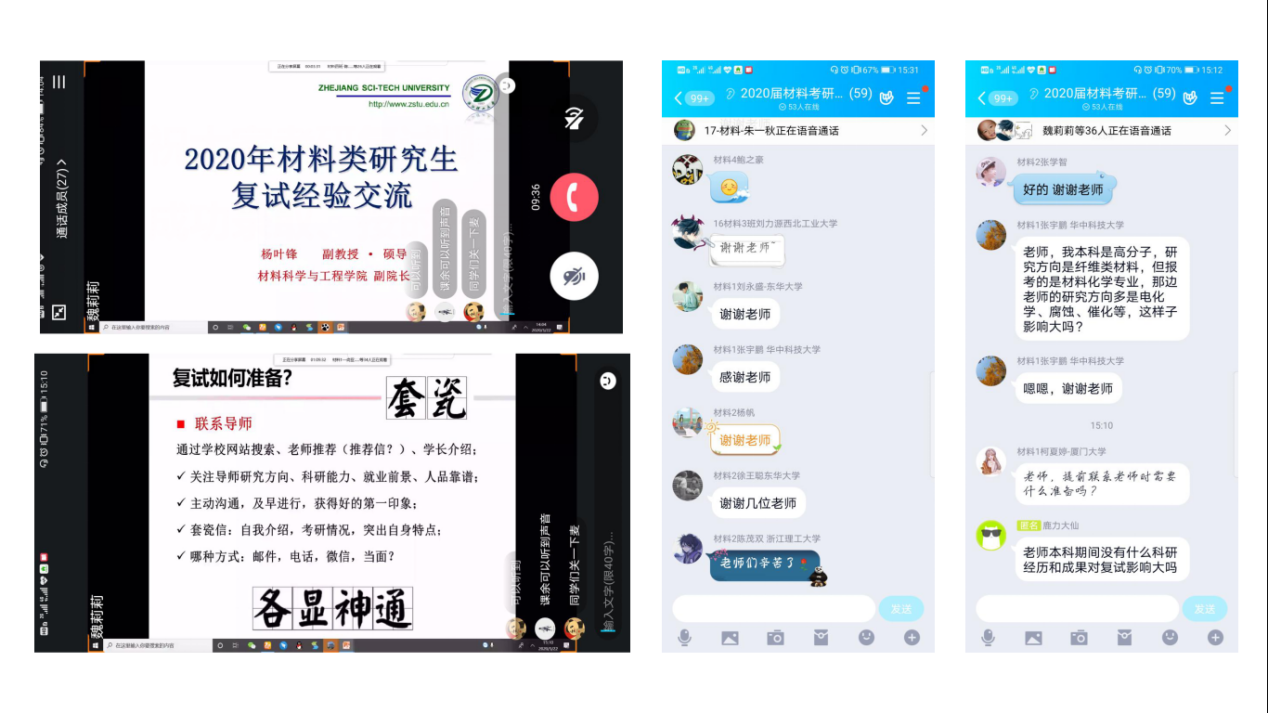 2020年3月22日下午14:00,材料学院2020届考研复试经验指导交流会在QQ群平台成功举办,学院副院长杨叶锋教授,学院党委委员周照东老师,学院团委书记、学工办主任魏莉莉老师,本科生辅导员魏厚钱老师以及30余名2020届考研毕业生一起参加了交流会。