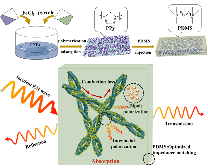 PPy/CNFs/PDMS制备流程及微波吸收机制示意图