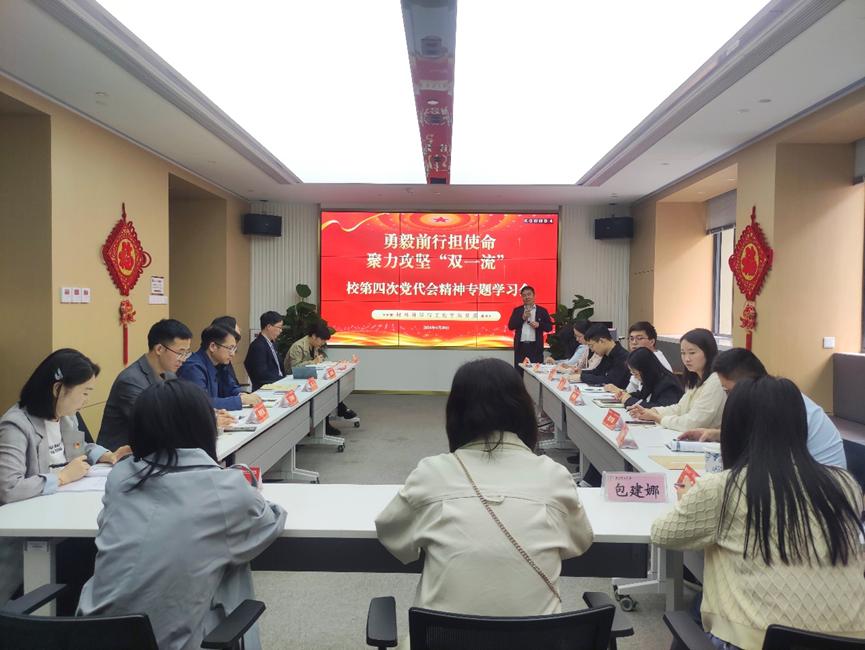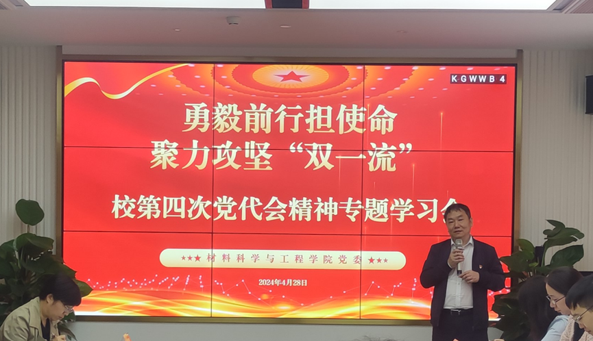 学院党委书记仰滢以图文并茂的形式系统宣讲第四次党代会内容。她全面回顾了学校第三次党代会以来取得的主要成就,标志性成果成绩喜人,质量立校、学术兴校、人才强校、特色名校、依法治校的办学理念进一步深化,“五个浙理”建设扎实推进。她全面阐述了新时代学校发展的方位、目标和战略,深入解读了党代会确定的“1113”总体工作布局,即围绕“高水平大学建设”这一鲜明主题主线,明确“聚力攻坚‘双一流’”这一核心奋斗目标,坚持“高质量特色化发展”这一整体战略,努力在“办学层次提升、重大标志性业绩产出、办学条件优化”三个方面取得新突破。她强调,聚力攻坚“双一流”,材料学院要积极主动担当作为,勇毅前行走在前列,围绕聚力攻坚“双一流”的任务举措,推动落实着力抓好人才培养、学科发展、科研创新、人才引育、社会服务、国际合作、内部治理、服务保障等八个方面重点任务,凝心聚力,笃行实干,助力学校奋勇冲刺“双一流”建设高校。