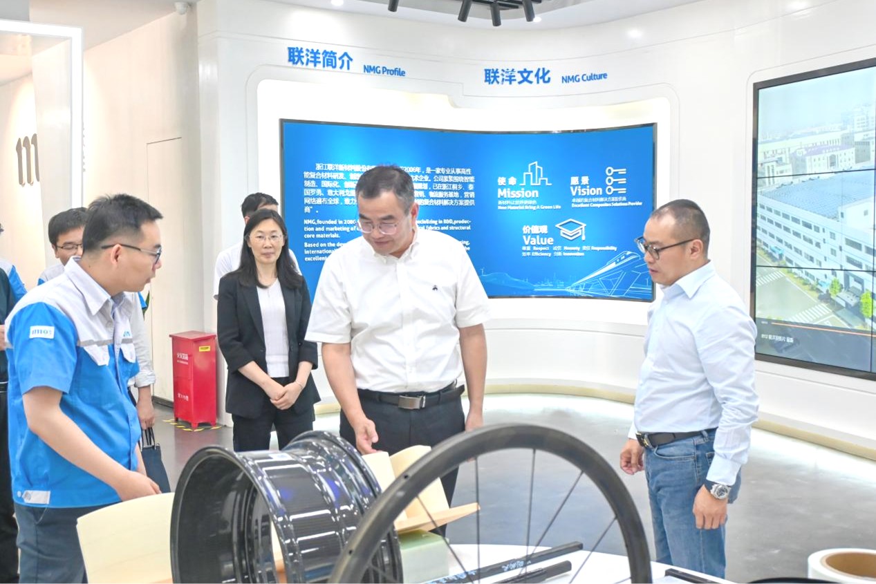 仪式前,姚菊明一行参观了浙江联洋新材料股份有限公司展厅,听取了公司企业文化、发展历程、业务范围及战略规划等介绍,观看了联洋新材最新科研成果。