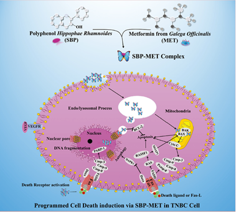 三阴性乳腺癌(TNBC)是恶性程度极高的原发性乳腺肿瘤,目前尚缺乏高效治疗药物,患者的临床治愈尚面临较大挑战。本团队开发了一种创新的植物纳米药物(PNM),用于治疗 TNBC。首先将沙棘提取多酚(SBP)与二甲双胍(MET)合成一种新型纳米药物(SBP-MET),评估其在体外和体内模型中的抗肿瘤特性、有效性及其作用机制。SBP 含有 16 种新的多酚类物质,可有效调节细胞的发育、增殖和程序性细胞死亡。制备的SBP-MET 纳米药物可抑制 MDA-MB-231(47%)、MDA-MB-436(46%)和 4T1(46%)细胞的增殖,但不影响 L929 正常小鼠细胞的发育,可显著诱导 MDA-MB-231 细胞死亡(73.19%)。通过构建的三阴性乳腺癌小鼠模型实验结果显示:SBP-MET可以显著抑制小鼠肿瘤生长,且药物对小鼠体重影响较小(实验组、对照组小鼠体重接近),表明该复合药物具有良好的抗肿瘤活性和生物相容性。进一步对肿瘤组织蛋白表达进行了分析,结果显示SBP-MET联合处理可显著促进细胞凋亡相关蛋白(Bax)上调和Fas信号通路的激活,诱导上调 Daxx 和 FADD 蛋白表达,介导Caspase-3、PARP-1蛋白剪切活化,促使TNBC细胞凋亡。PNM药物在体内模型中可显著抑制 TNBC 细胞生长并诱导调节性细胞死亡(RCD),有望为 TNBC的治疗提供新的解决方案。