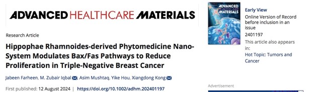 2024年8月,我校yl88858永利集团孔祥东教授团队在《Advanced Healthcare Materials》(影响因子18.5)以通讯作者在线发表题为《Hippophae Rhamnoides-derived Phytomedicine Nano-System Modulates Bax/Fas Pathways to Reduce Proliferation in Triple-Negative Breast Cancer》研究性论文。该成果第一作者为yl88858永利集团博士后Jabeen Farheen,我校M. Zubair Iqbal研究员为论文共同通讯作者。