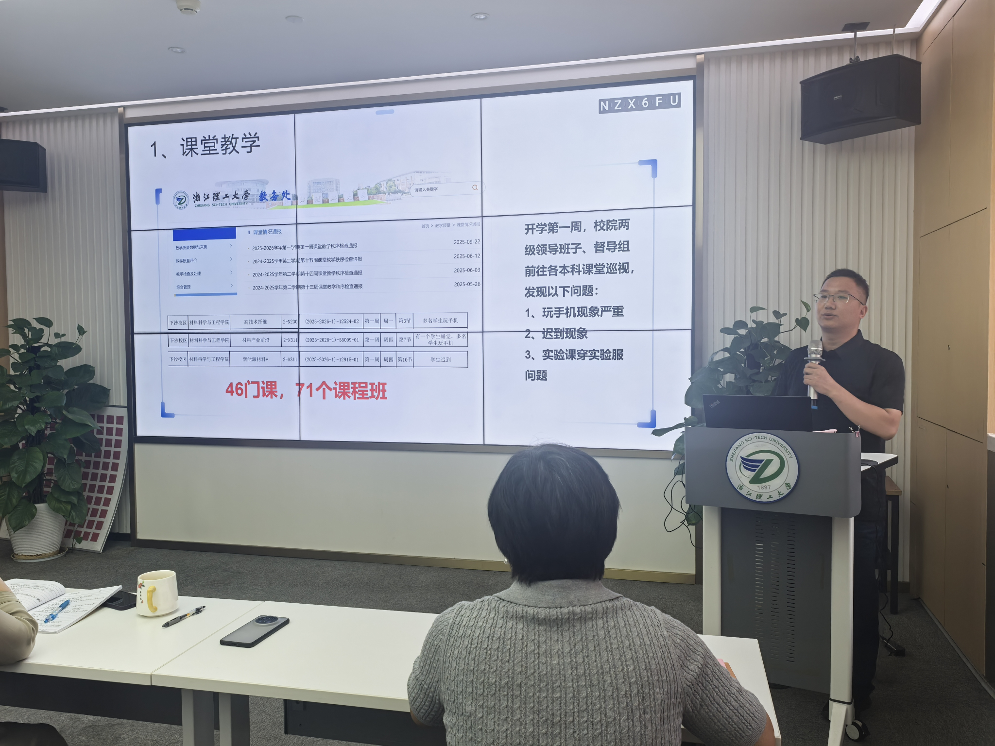 副院长付飞亚汇报了本科教育教学工作情况,要求及时关注教务处巡课反馈,严格课堂纪律,推进教学成果培育与课堂建设,完善本科生导师制,并持续推进本科专业认证与一流专业验收工作。