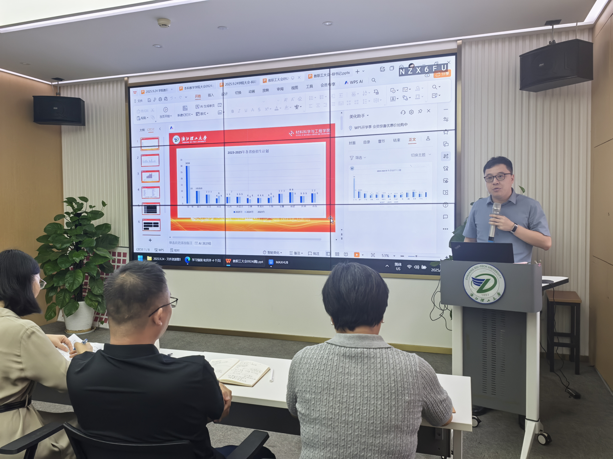 院党委副书记、纪委书记魏莉莉围绕学生工作与党风廉政建设作出安排。她通报了2025年招生、本科生学业情况及科研竞赛情况等,并布置了优秀校友信息收集工作。此外,结合“双节”临近,她开展了廉洁警示教育,严明节日纪律。