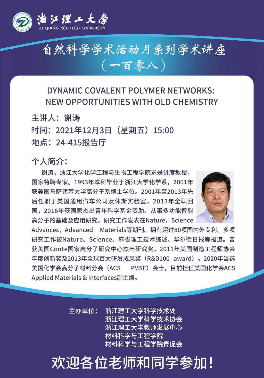 学术讲座 当前位置: 首页 > 学术讲座 > 正文 学术讲座【33】:Dynamic Covalent Polymer Networks: New Opportunities with Old Chemistry 作者:时间:2021-12-01浏览次数: