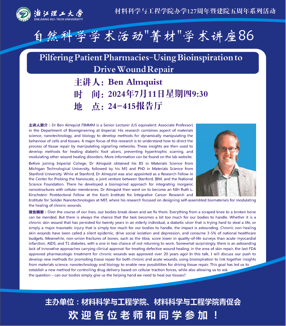 学术讲座 当前位置: 首页 > 学术讲座 > 正文 学术讲座【86】:Pilfering Patient Pharmacies–Using Bioinspiration to Drive Wound Repair 作者:时间:2024-07-10浏览次数:
