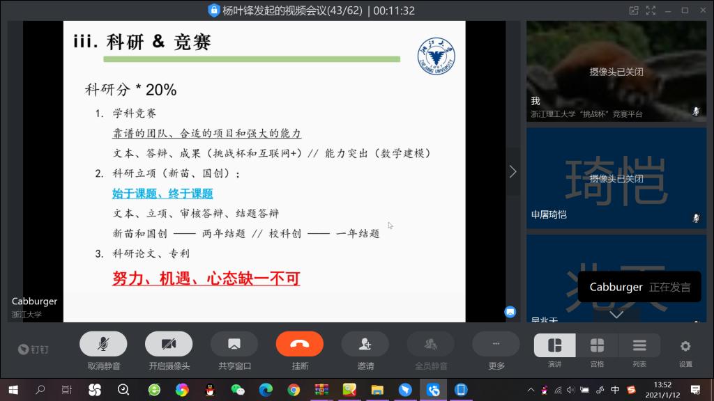 为进一步推动学院考研深造工作,2021年1月12日下午,材料学院在钉钉平台举行线上求学深造专题讲座。学院副院长杨叶锋、学院党委副书记周照东、2019届材料科学与工程校友单心怡、20120届材料科学与工程校友蔡浩然和学院来自2018级、2019级有志考研的60余名同学参与,讲座由杨叶锋老师主持。