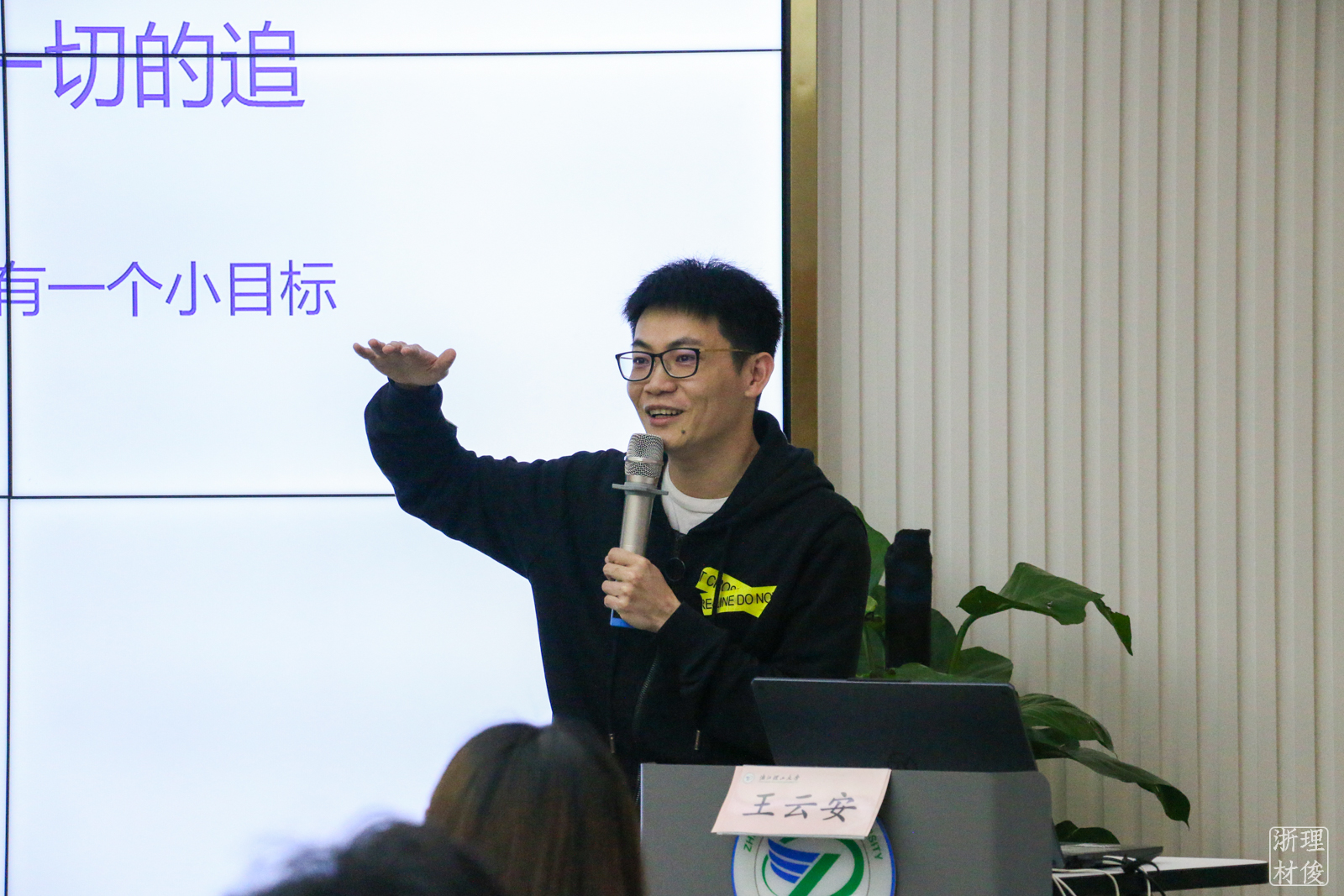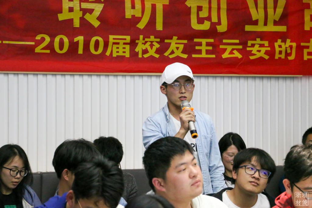 然后,王云安分享了他大学时期和创业过程中的一些小故事,讲述了他的创业故事和心得感想。他指出,创业是一条不归路,我们必须认清自己的重要性,只有认清自己的定位,才能更好的面对困难,享受成果。王云安强调,“厚德致远 博学敦行”是指导他创业成功的法宝,一个人的格局十分重要,厚德、博学都是创业路上获不可缺的品质,我们要着眼于当下,不断学习并付诸实践才可能有所收获。同时,他以自己的经历为例子,鼓励同学们尽早树立一个小目标,然后一个台阶一个台阶踏实地向前走。