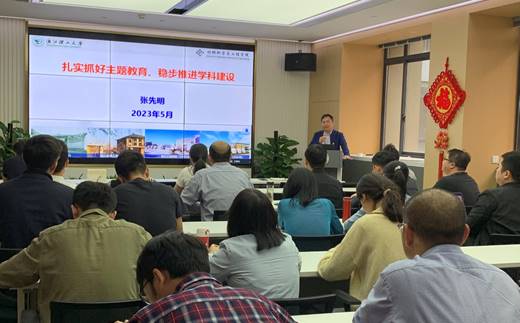 在讲党课环节,张先明院长以“扎实抓好主题教育,稳步推进学科建设”为主题,以学思想、强党性、重实践、建新功为主线,结合学院实际和高分子学科发展,分享了自己对习近平新时代中国特色社会主义思想的学习体会,以及对学院高分子学科的认识和思考。他强调,作为教育工作者,要始终牢记党的教育方针,始终保持共产党人的政治本色,发挥自己的专业特长,着力推进学院高分子学科教学和科研水平的提高,突出我院高分子学科的特色和亮点。